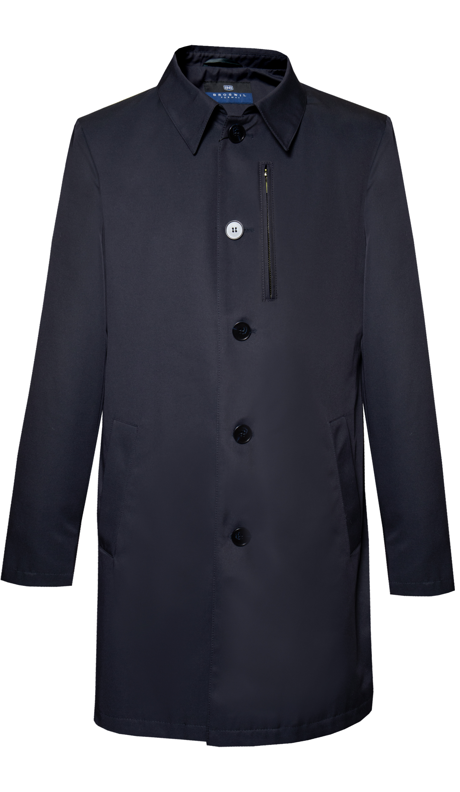 Плащ мужской полуприлегающего силуэта с центральной бортовой застежкой на 5 петель и пуговиц. Полочки с прорезными боковыми карманами «с листочкой». Спинка со средним швом, средний шов заканчивается шлицей. Воротник отложной с отрезной стойкой. Рукава втачные двухшовные. Плащ на подкладке. На подкладке полочек вставки из ткани верха с прорезными внутренними карманами «в рамку». В левом внутреннем кармане фигурная пата, застегивающаяся на прорезную петлю и пуговицу. На подкладке спинки-декоративная накладка из ткани верха. По воротнику, борту, среднему шву спинки, по локтевым и плечевым швам, вокруг боковых и верхнего карманов, по швам притачивания подкладки к подбортам проложена отделочная строчка шир.0,2 см. По низу изделия и рукавов проложена отделочная строчка шир.2,5 см.
